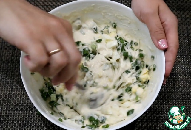 Яйца нарезать кубиками. Зеленый лук измельчить. Лук с яйцами перемешать с тестом.