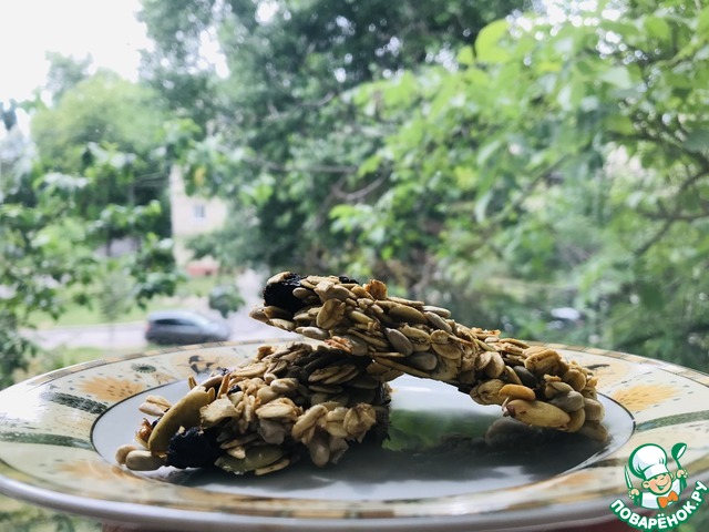 В форму для запекания высыпаем орехи, семечки и геркулес. Отправляем в духовку, разогретую до 180 градусов, на 10 - 15 минут. Несколько раз при этом перемешиваем.