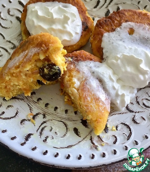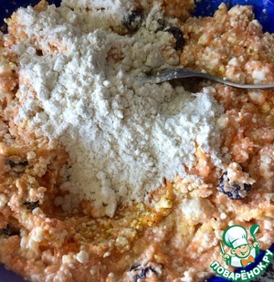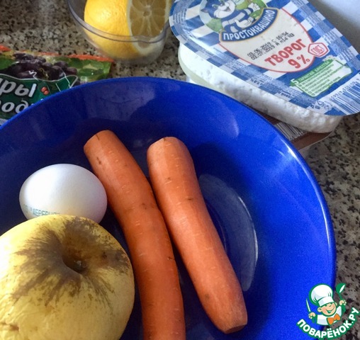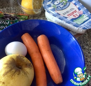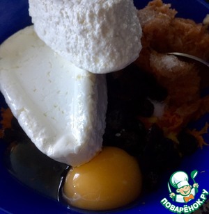 Соединить творог, морковь, яблоко, яйца, изюм. Тщательно перемешать.