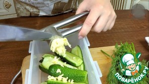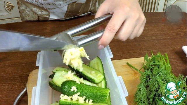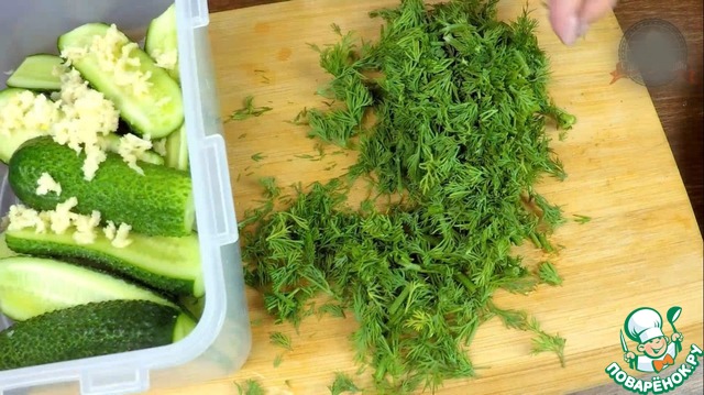 Солю огурцы. Закрываю контейнер крышкой и активно встряхиваю ингредиенты. Таким образом, огурцы друг об друга обобьются и пропитаются соком чеснока и укропа. 30 секунд активной тряски будет достаточно!