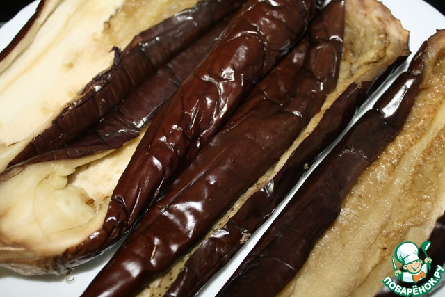 Готовые баклажаны разрезать по полам и аккуратно вытащить мякоть.