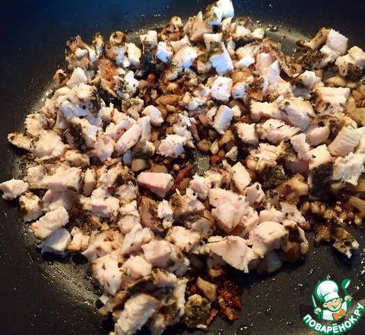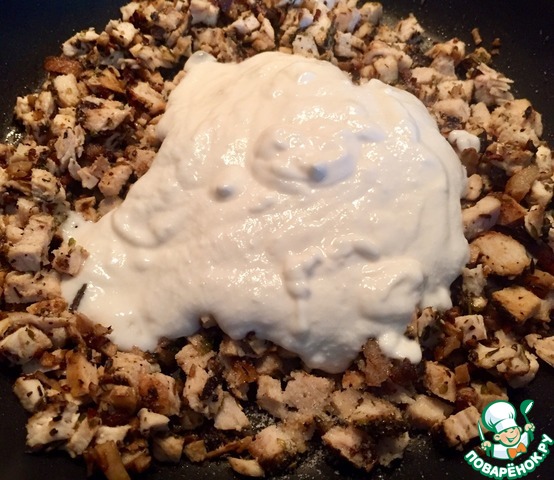 • Йогурт и плавленый сырок добавить к грибам с курицей.