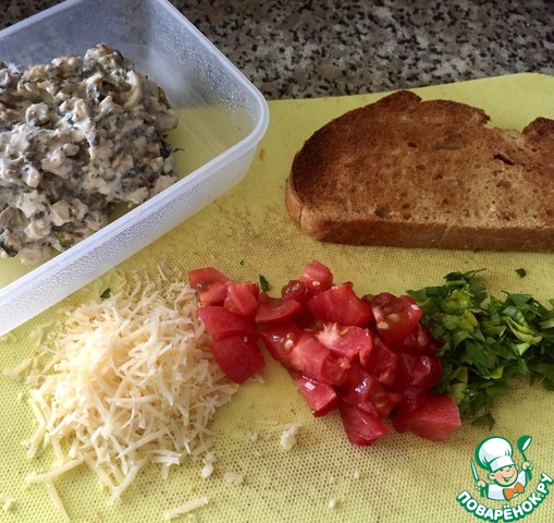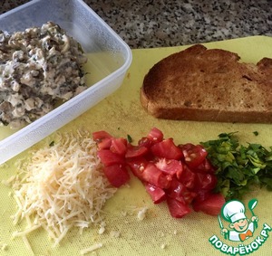 • Помидор мелко нарезать, сыр натереть на мелкой тёрке, хлеб подсушить или в тостере, или на сковороде без масла.