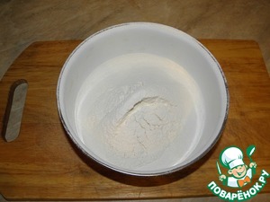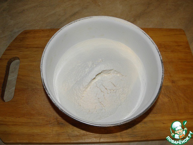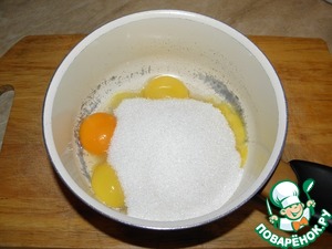 Постепенно, постоянно помешивая, всыпаем муку, просеянную с разрыхлителем, к взбитым сахарным желткам