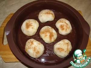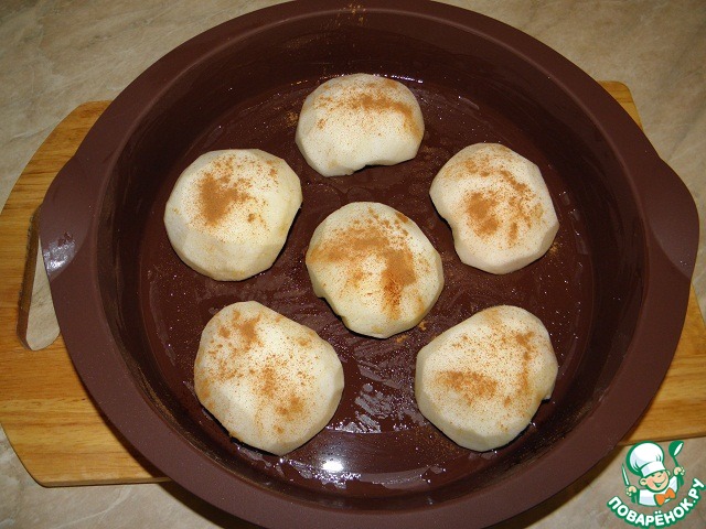 На дно выкладываем яблоки плоской стороной вниз. Посыпаем их корицей. -