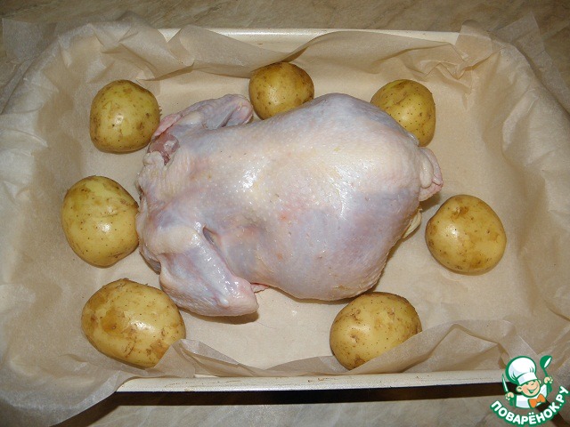 Затем курицу хорошо обсушить полотенцем (бумажным и т. д) противень застелить пергаментом, выложить птицу и обложить некрупным картофелем (я лук еще кидаю иногда целый 1-2шт)