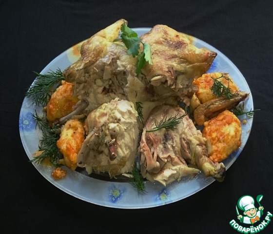 Птица после приготовления таким способом имеет слегка розоватый оттенок мяса (чем то на копченую похожа по цвету) (настолько мягкая, что можно косточки не заметить))) и тонкая хрустящая корочка снаружи)Приятного аппетита!
