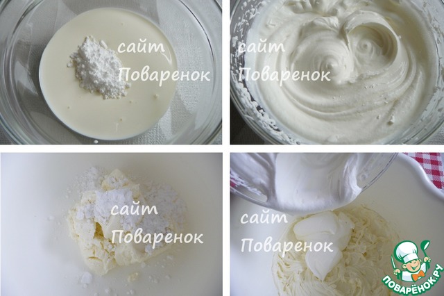 Для приготовления крема, взбить сливки с одной чайной ложкой сахарной пудры до устойчивых пиков.