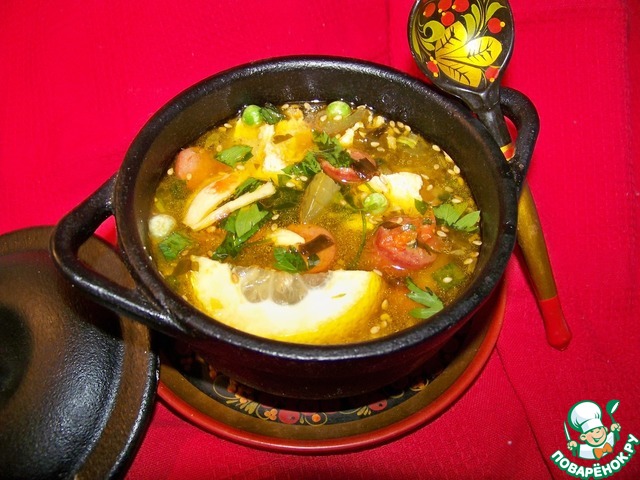 Традиционно это блюдо готовится на крепком мясном бульоне, с обилием копченостей. Но летом хочется еды полегче, вот и используем куриный бульон, совсем немного бекона и свежие помидоры - почти диетическая солянка. Угощайтесь.