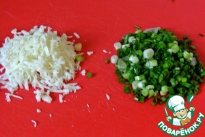 Сыр натереть на крупной терке. Зеленый лук мелко нарезать.