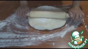 Когда тесто подошло, достаем его и немного подмесим, припылив стол мукой. Оставим на 5 минут и потом раскатаем в пласт толщиной 5 мм. Берем чашку или стакан и выдавливаем заготовки для пирожков.