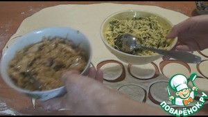 Берем одну заготовку, немного растянем руками, выкладываем посредине начинку, сверху накрываем второй заготовкой, прищипываем края и потом пальцами распределим начинку. И так лепим все пирожки, пока налепим половину, первые немного подойдут и можно жарить.