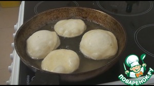 На сковороду наливаем подсолнечное масло толщиной в палец-полтора, раскаляем его и выкладываем пирожки, чтобы они плавали в нем. Обжариваем с двух сторон на среднем огне, чтобы тесто не горело, а прожарилось.