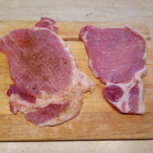Мясо нарезать как на отбивные, не толстыми кусками. Хорошо отбить, посыпать посолочной смесью по одной-две щепотки на каждую сторону куска.