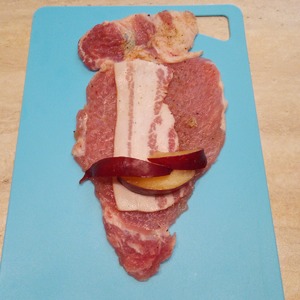 На кусок мяса положить половину полоски бекона. Сверху на бекон, ближе к краю 3-5 долек сливы.