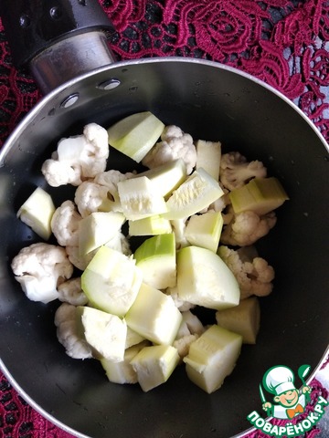 Цветную капусту разобрать на соцветия, кабачок нарезать кубиками. Отварить в подсоленной воде до мягкости.