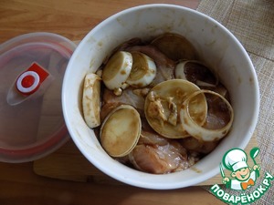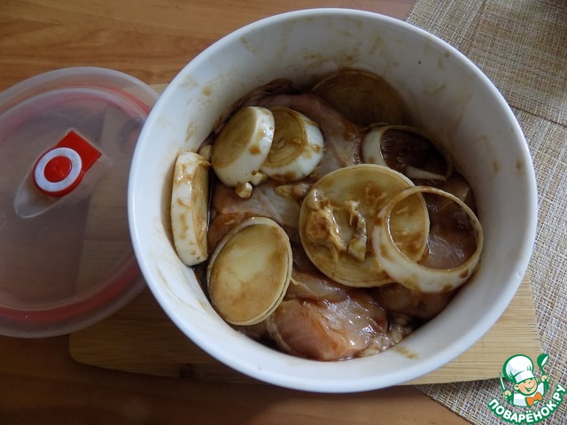 Я взяла грудку от целой курицы. Отрезала её вместе с косточкой. Сняла с неё кожу. Помыла, обсушила бумажным полотенцем. Выложила в посуду с крышкой. Налила соевого соуса. Порезала луковицу кольцами, чеснок произвольно порезала и отправила к грудке. Перемешала руками, накрыла крышкой и дала замариноваться прямо на столе 30 минут. Пару раз перевернула грудку за это время. Не солила. Я делаю диетическую грудку, мне хватит соевого соуса. Не перчила. Поперчить можно по желанию готовое блюдо.
