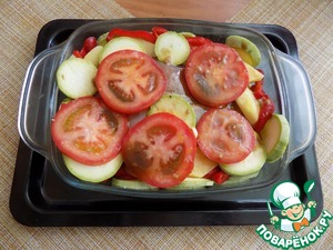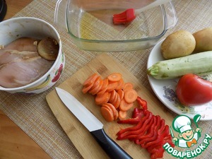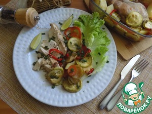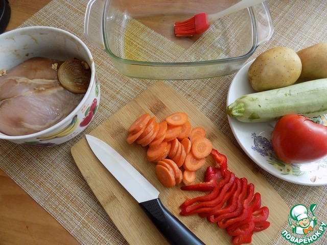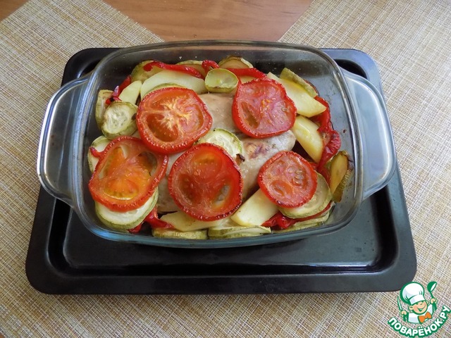 В форму нижним слоем выложила "пятачки" моркови, на неё-кольца лука из маринада. Положила грудку. Все свободные места заполнила порезанным перцем, кабачком и картофелем. Верх грудки обложила дольками помидора. Овощи совсем немного присолила морской солью. Облила всё маринадом из-под грудки вместе с чесноком. Второй ст л оливкового масла равномерно сбрызнула верх блюда.