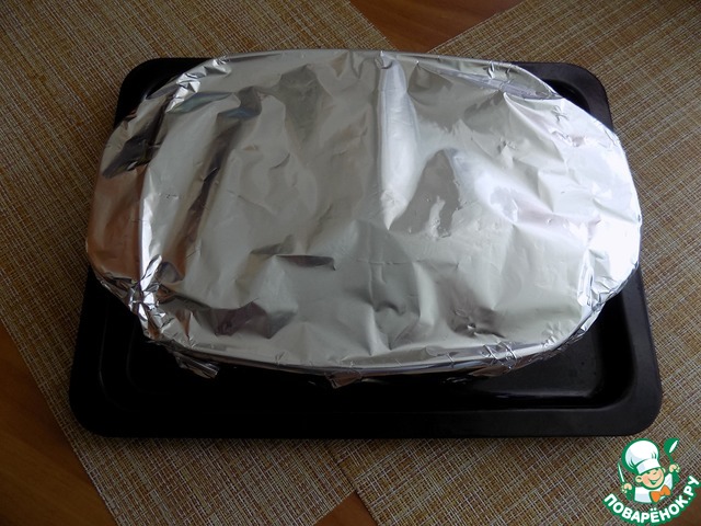 Накрыла форму с содержимым фольгой. Поставила форму сразу в духовку, она у меня стеклянная. Выставила т-180 С и время 1 час.