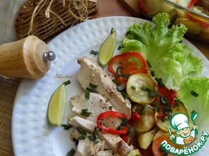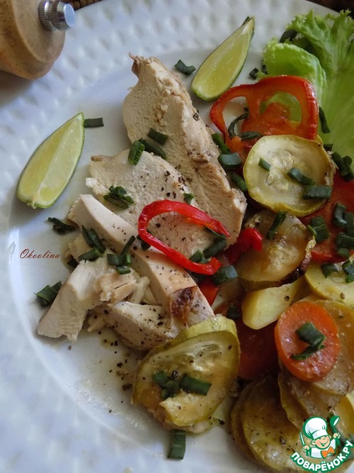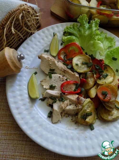 Диетическое блюдо. Куриная грудка с овощами ассорти, замаринованная в натуральном соевом соусе и запечённая в духовке в собственном соку и соке овощей.