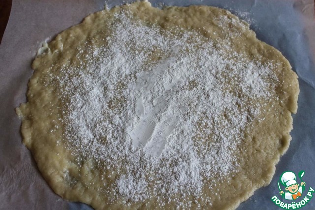 Тесто раскатать в круг толщиной 5 мм, можно сразу на бумаге для выпечки, сверху посыпать крахмалом (через ситечко).