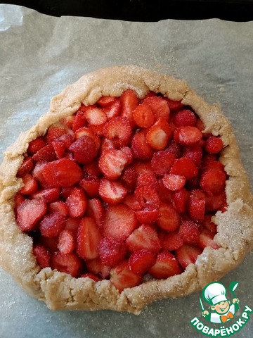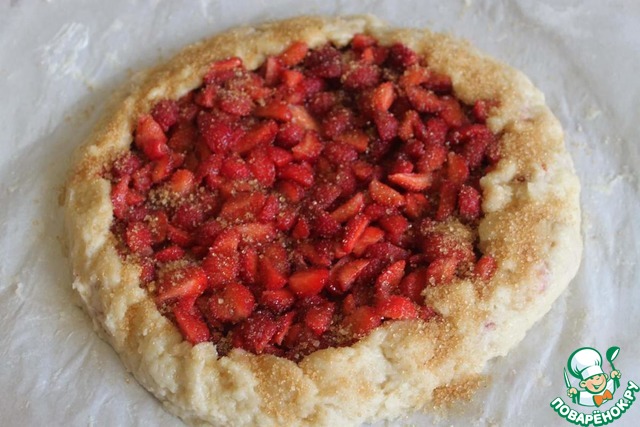 Клубнику - на четвертинки. Выкладываем клубнику, отступая от края примерно по 2 см. Посыпать двумя ложками сахара.