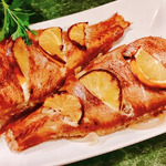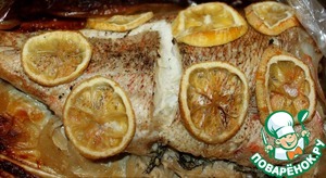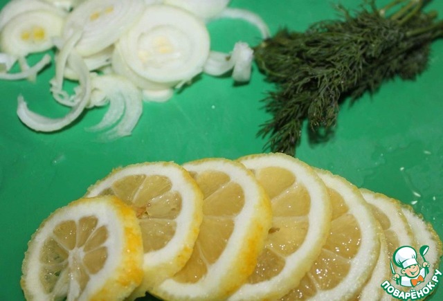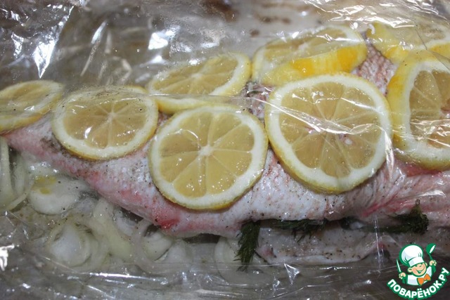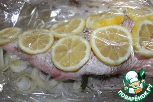Я запекала в рукаве для запекания, на дно укладываем лук, сверху - рыбку, внутрь рыбки - зелень, на рыбку - кружочки лимона.