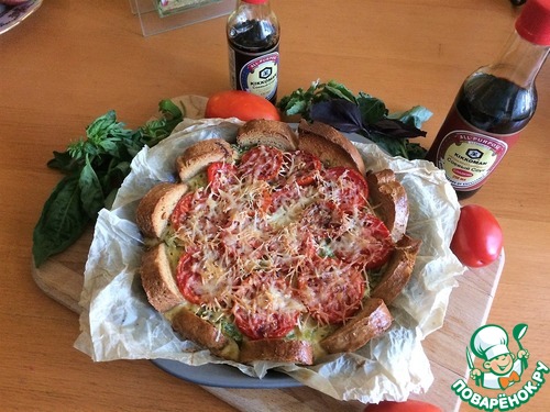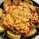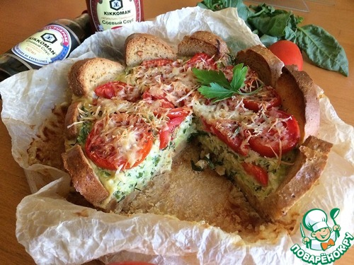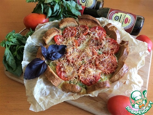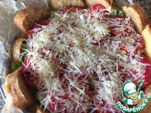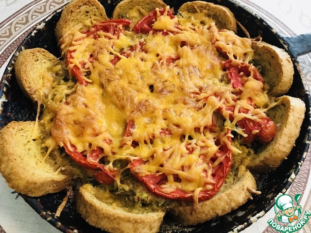 Массу выложить в форму на ломтики хлеба Сверху распределить кружки помидора, посыпать оставшимся сыром, сбрызнуть растительным маслом