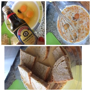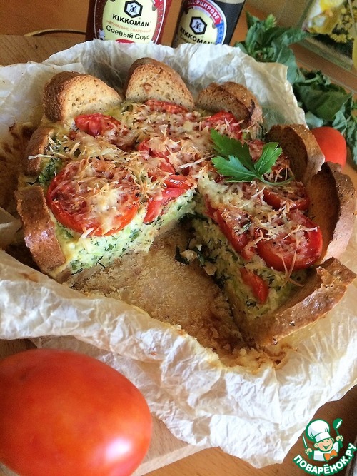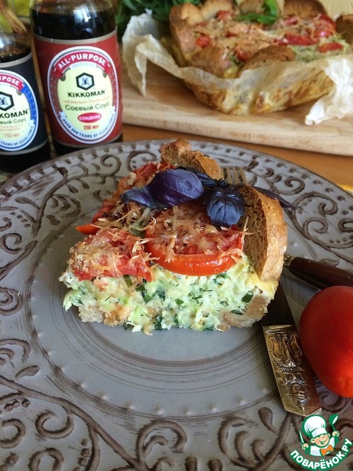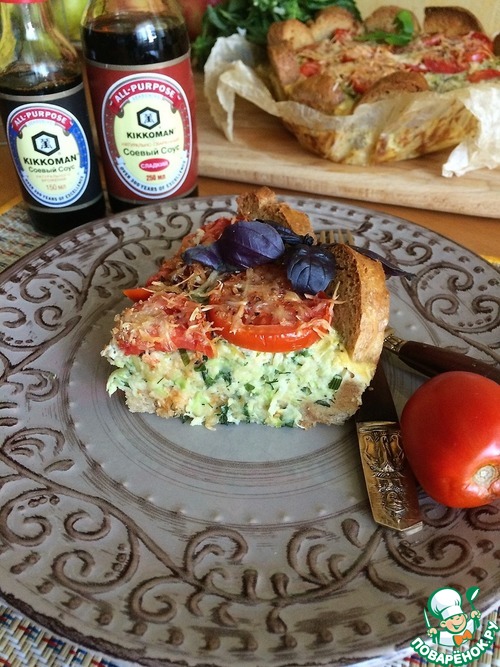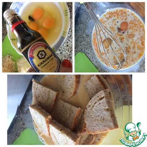 Форму выстлать бумагой. Яйца взбить с натуральным соевым соусом, сливками, поперчить. Если вам соли мало от соуса, то подсолить. Хлеб нарезать на 15-18 кусочков, в зависимости от размера вашей формы. Окунуть его в яичную смесь и выложить дно и края формы. Запекать 5 минут.