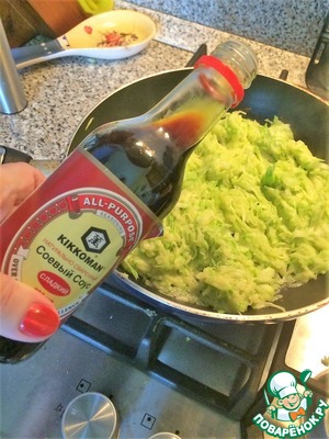 Кабачок натереть на крупной тёрке, обжарить на 2 ст. л. масла с добавлением сладкого соевого соуса и оставшейся яичной смесью. Добавить 2/3 сыра, хлебные крошки, нарезанную зелень.