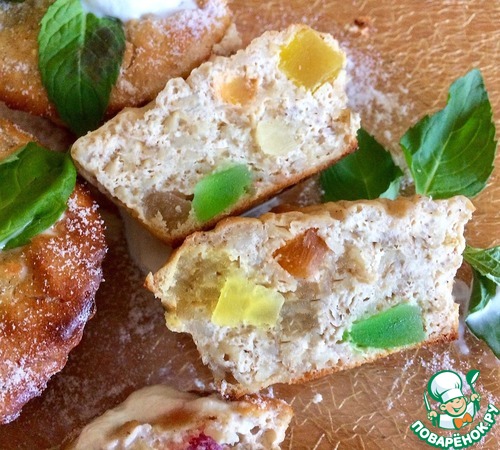 Добавить геркулес, цукаты, разрыхлитель, ванильный сахар, хорошо всё перемешать.