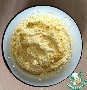 В миске как следует размешиваем ложкой 3 желтка и 0,5 стакана сахара, добавляем нарезанное на кусочки размягчённое масло и хорошенько взбиваем миксером, чтобы сахар почти растворился