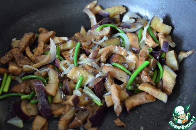 Баклажан нарезать брусочками, обжарить на растительном масле с луком и чесночными стрелками.