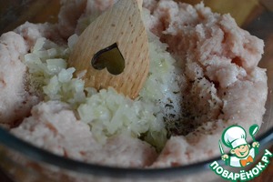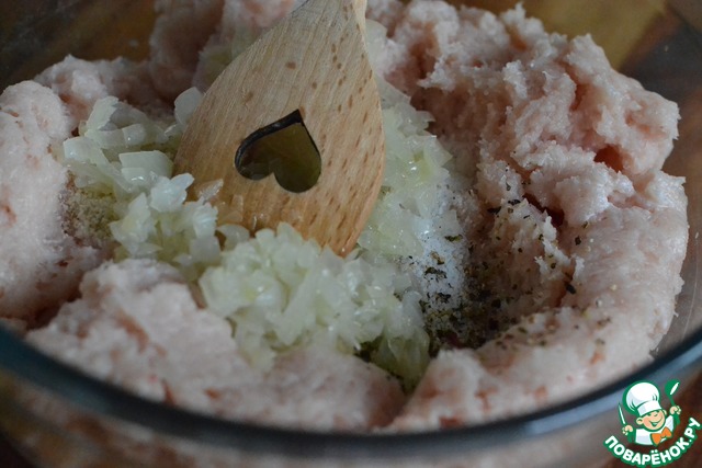 В отдельной миске смешать индюшачий фарш, лук, соль, перец, яйцо и панировочные сухари. -