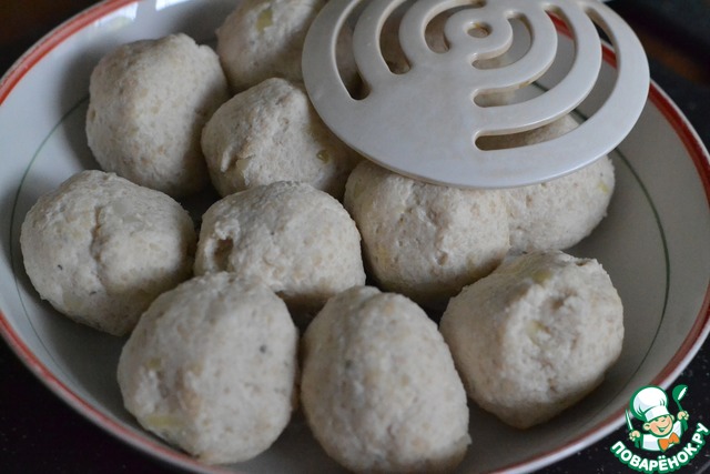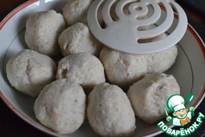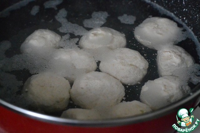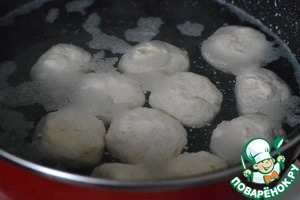 В большой кастрюле довести воду до кипения. Посолить и аккуратно, порциями, отварить фрикадельки. После того, как фрикадельки всплывут варить 2 минуты.