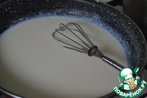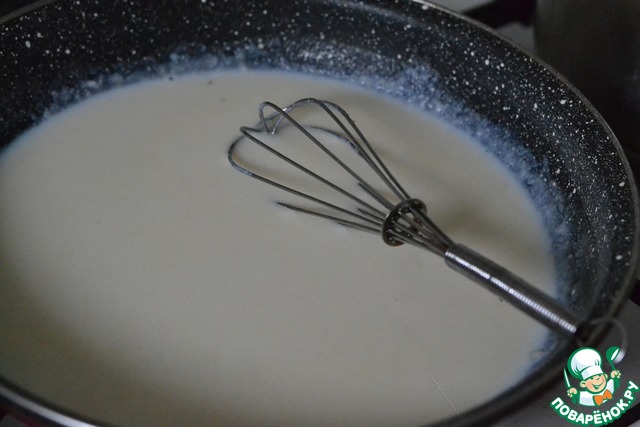 На сковороде растопить масло, добавить муку и, постоянно мешая, добавить молоко.