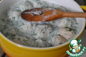 Залить укропным соусом бешамель фрикадельки, прикрыть крышкой кастрюльку и запекать при 200гр 20 минут.