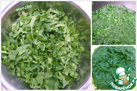 Приготовить пюре из шпината: шпинат порезать, переложить в сковороду (кастрюлю), добавить воду и нагревать до умягчения шпината минуты три, постоянно помешивать. Шпинат измельчить до пюреобразного состояния, остудить.