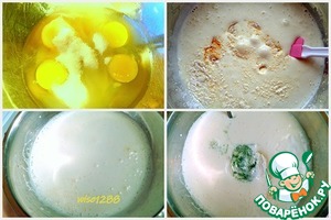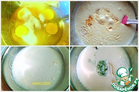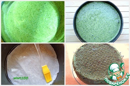 Включить духовку на 180 градусов. Приготовить бисквит: яйца взбить с сахаром и солью в течение 5 – 7 минут. Добавить ванилин, разрыхлитель, соду пищевую, муку пшеничную, цедру, пюре из шпината.
