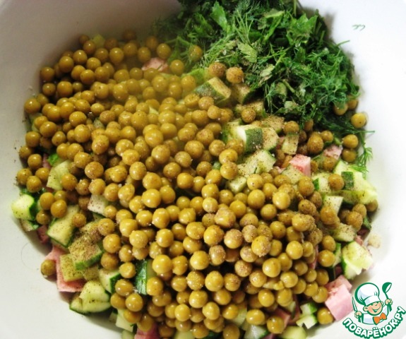 Добавить зеленый горошек (жидкость из банки предварительно слить), мелко нарезанную зелень укропа и петрушки. Приправить солью и черным перцем по вкусу.