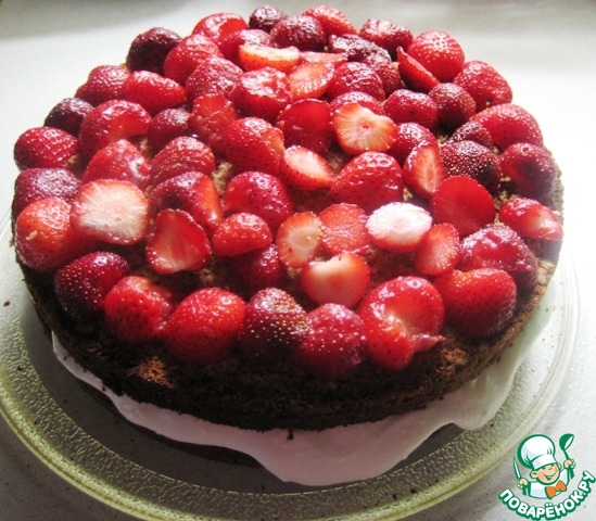Собираем торт: ореховый бисквит, сверху выложить разрезанную пополам клубничку.