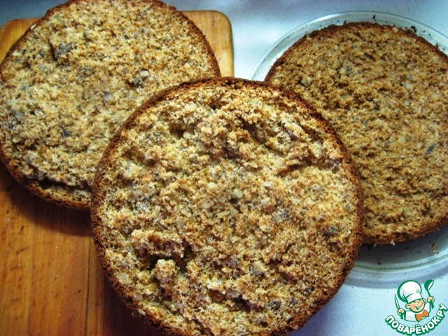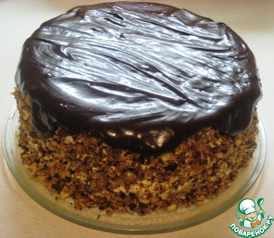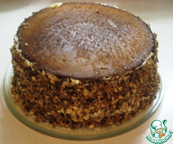 Бока торта покрыла творожным кремом и обсыпала крошкой (измельченные в блендере кусочки срезанного с поднявшегося верха бисквита + грецкие орехи).