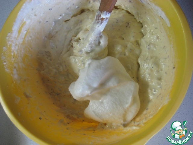 Затем в 3-4 приема несколькими аккуратными движениями вмешиваем оставшиеся белки.