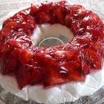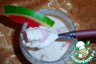 Достать застывший десерт, форму поместить на минутку в горячую воду, затем перевернуть ее и можно наслаждаться освежающим летним десертом!