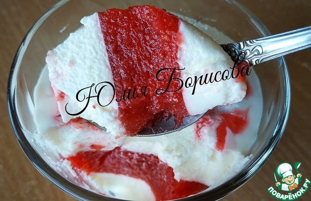 Нежнейшее, как облачко желе. Сочетание сметанных и клубничного слоёв божественны. По консистенции больше напоминает мусс, нежели желе. В жару очень освежает, когда особо ничего не лезет, такой десерт в самый раз) Выставлять рецепт не собиралась, т. к. готовила по этому рецепту первый раз, потому пошаговых нет, но, думаю, и так всё понятно. Вставлю просто три фото с других ракурсов в пошаговые... В общем, рекомендую попробовать эту вкусняшку, кто питает слабость к такого рода десертам.