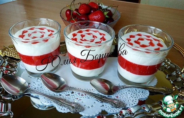 Я украсила так: на верхний белый слой до того, как убрать в холодильник, нанесла капельки клубничного желе и провела зубочисткой в одном направлении, не отрывая зубочистки по серединкам капелек, таким образом получаются сердечки.
