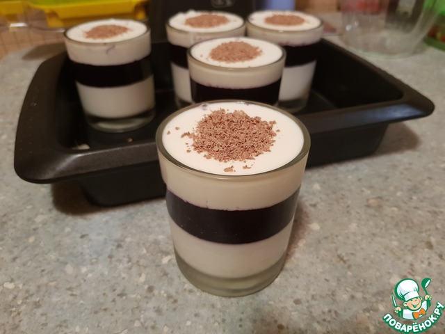 Последним слоем вылить оставшееся белое желе, украсить на своё усмотрение (можно посыпать шоколадной стружкой или нарисовать что-нибудь, используя клубничное желе).