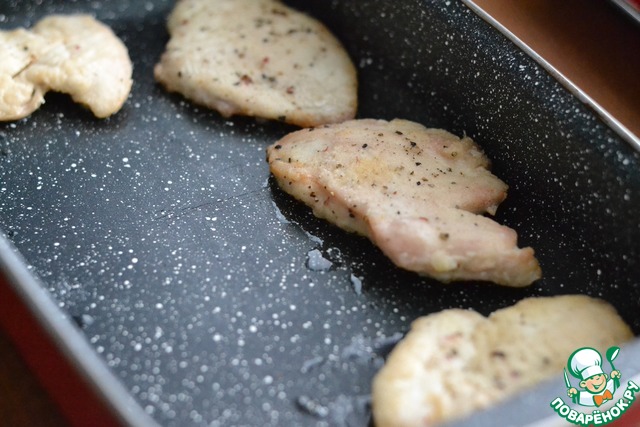 Обжаренную грудку выложить в подготовленную форму для запекания.