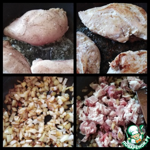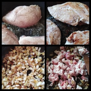 Куриное филе обмазать солью и перцем, обжарить с двух сторон до готовности. Лук нарезать кубиком обжарить. Добавить бекон, порезанный кубиком.