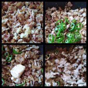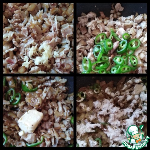 Добавить чеснок пресованный чеснокодавкой, перемешать. Нарезать перец, добавить к луку, положить сливочное масло 40 г, затем добавить 40 г муки и перемешать.
